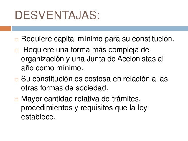 Entre las principales desventajas de la sociedad anónima se encuentran: Gestión administrativa: es mucho más compleja la gestión administrativa que las demás sociedades. Capital mínimo: el capital mínimo es de 60. Funcionamiento rígido: el funcionamiento de la sociedad anónima es mucho más rígido respecto a otro tipo de sociedades. VENTAJAS DESVENTAJAS -Responsabilidad.