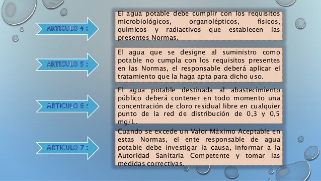 La Organización Mundial para la Salud (OMS), establece algunos parámetros para la calidad del agua potable que son punto de referencia internacional para el marco de estándares y seguridad del agua potable. Artículo Del ámbito de aplicación de esta Norma se excluyen: 6. Límites permisibles de calidad y tratamientos a que debe someterse el agua para su potabilización. Water quality, including safety and health of potable water for human consumption.